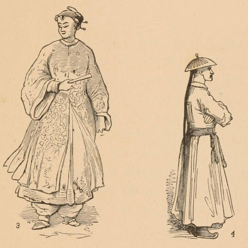 The figures on the opposite page give an illustration of Chinese women in full dress. Fig. 3 represents a married lady with her hair tied on top of the head. A quantity of false hair was used to make a tuft as large as possible, filled with gold or silver pins, the ends of which were highly ornamented with jewels. Artificial flowers were often used to ornament the head. But the favorite coiffure—the object of a Chinese lady’s greatest admiration—was an artificial bird, formed of gold or silver, intended to represent Fong-Whang, a fabulous bird of which the ancients relate many marvellous tales. It was worn in such a manner that the wings stretched over the front of the head; the spreading tail made a kind of plume on the top, and the body was placed over the forehead, while the neck and beak hung down; and the former, being fastened to the body with an invisible hinge, vibrated with the least motion.