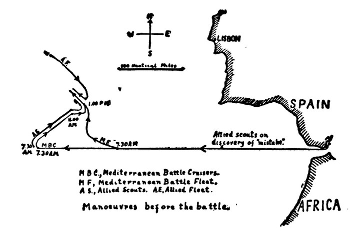 And now activity of special interest was discovered. A considerable detachment of the Allied Navy, scouts and armored cruisers, together with four of the older battleships, was cruising to the eastward of the Azores and approaching near enough to the coast of Portugal to make things look very interesting. Intercepted messages and radio-compass bearings taken on their signals by the shore stations at Vigo, Lisbon, and Gibraltar told the story, leaving no chance of mistake as to the actual approach of ships to the coast. Such a force as this, if cut off from the rest of the Allied fleet, would be easy prey for the Mediterranean Navy; and a chance to destroy it would be a golden opportunity, for the loss of these cruisers and battleships, even though the latter were nearly obsolete and inferior to the first-line capital ships, would be a serious blow to the Allies; it would measurably weaken their navy, and greatly improve the outlook for a subsequent battle between the two fleets.