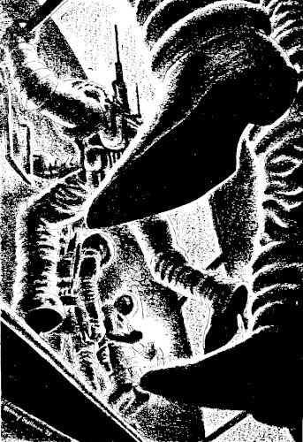 One of the contact rods projected from its sheath near the hatch to a point within reach of the other ship's lock. Stokely set out carefully, hand over hand, and Archer followed him, gripping the rod firmly with each hand in turn. This was no time to make a slip and go drifting off into nowhere. The pistol at his side would provide a means of getting back, but an awkward one, because one's center of gravity was difficult to judge accurately, and if the shot were not closely aligned to it, one stood an excellent chance of converting himself into a human pinwheel.