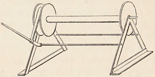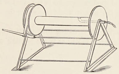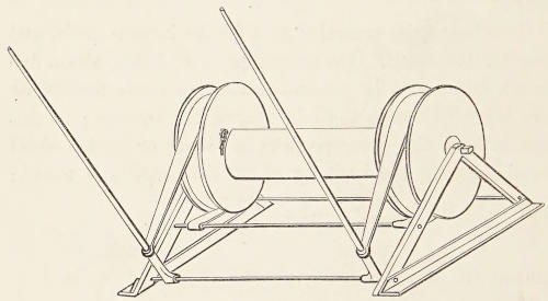 The handles, formed of iron straps passing under the torpedo, and terminating in four eyes above the deck, are principally for handling it; one of the foremost eyes is made use of as a fair lead for the safety-key lanyard, and to stop it to; the other foremost is made use of to secure the side lanyard to Fig. N (p. 12).