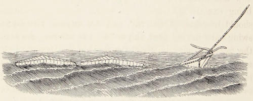 In this case, two torpedoes are launched, port and starboard, each diverging to its full extent; when passing the vessel attacked, one or the other of the tow-ropes is brought across the cut-water, and by the simultaneous motion of the two vessels in opposite directions, the torpedo is brought alongside of or under the bottom of the vessel attacked, as shown by the drawing. The torpedo vessel should keep the masts of her enemy in one until close to, when either torpedo will be used, according to the movement of the enemy. At the time of the tow-rope taking the cut-water, the brake is suddenly eased up; the tow-rope will then pass under the bottom, when, by checking the tow-rope, the torpedo will be hauled under the bottom.