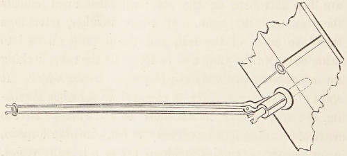 To secure the fore top lever to the after, in order that a back hit may not separate them, the small lanyards, with an eye in one end, and whipped at the other, are first placed over the eyes in the fore top lever, then rove through the brass hole in the after top lever, in opposite directions, passed up through the eyes in the fore top lever, and knotted over it. The distance from the eyes in the fore top lever to the hole in the after top lever is so arranged[14] that it will not interfere with the descent of them. The fore-locks for the various bolts which fix the levers are made of fishing-line. After knotting them, the ends should be secured together by a seizing of thread.