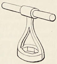 The brass guard for the exploding bolt is an extra precaution (suggested by Capt. A. Hood, R.N., Director-General of Naval Ordnance) should any person by mistake attempt to place the bolt into the torpedo without the safety key in its place. It is placed over the head of the bolt and pushed down until the thumb-screw on the side works into a small hole in the shoulder of the bolt.[1] The manner in which this guard is fitted ensures its removal before launching, since the after lever cannot be placed until it is. It also makes a convenient handle for turning the bolt in the magazine.