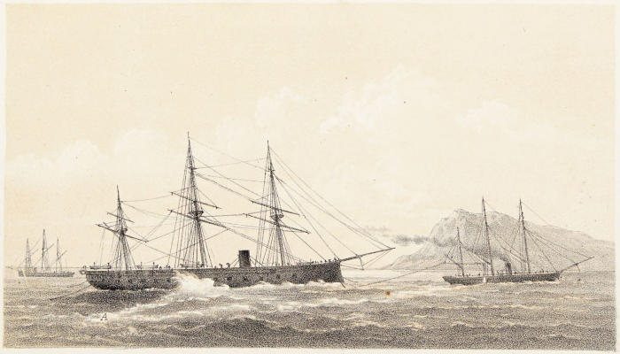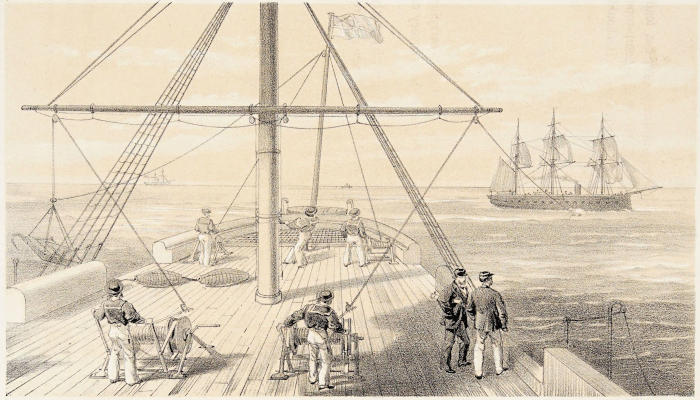 The height of the weather-deck above the water-line at midships, 9 feet; the height of the main deck above the water-line, 18 inches; leaving a clear height between decks of 6 feet 6 inches. There should be two water-tight bulkheads, one about 50 feet from the stem, and the other about 20 feet from the stern-post; the two water-tight bulkheads come up to the under side of the main deck, with which the bulkhead form perfectly water-tight compartments. In the fore compartment, empty water-tight cases would occupy the lower part, over which would be stowed the cork buoys and some light resisting material, rendered uninflammable, so that in the event of the fore body being ripped open below the water-line, there would be no space for the admission of water; the trim of the vessel would therefore be preserved. The after compartment would be similarly stowed. There would be a capacious engine-room[42] to allow of powerful engines to work twin screws; there would also be capacious coal-bunkers and a coal-hold before the engine-room; and before the coal-hold a small hold for the stowage of cables and various articles. There would also be a pilot-house, in which would be protected the officer in command, who would be so placed as to have his orders immediately obeyed. The torpedo-room, to contain about one hundred torpedoes of various destructive powers, the weight of which may be about 10 tons, would be in the after body, and as low down as may be convenient. Upon the orlop deck, which covers the magazine, would be the towing gear, and machinery for working such gear. On the orlop deck would also be a steering wheel, by which the vessel would be steered when in action. The space between the decks of the entire length of the vessel would afford ample accommodation for officers and crew, embracing, also, stowage for provisions and means of cooking. Ventilation and light would be obtained by hatchways, fitted with skylights; and there would also be side scuttles, which, from their height above water, would admit of their being generally open. The rig would be that of a three-masted schooner, having fore, main, and mizen gaffsails, with a fore staysail and two jibs, inner and outer. When going into action, the sails would be lowered and stowed; the vessel would then be entirely under steam. To each mast there would be a yard of suitable dimensions, for the double purpose of towing the torpedoes and setting flying square sails. The rigging would not be rattled; the ascent to the masthead would be by a Jacob’s ladder before the mast; there would be a small top to each masthead, principally for the use of the look-out men. The crew would be stationed upon the orlop deck, each man[43] being provided with a life-belt. With regard to boats, there may be a small stern boat, and two larger boats, stowed on deck; and upon going into action, gripes or lashings should be cast off so that the boats would instantly be disengaged from the vessel.
