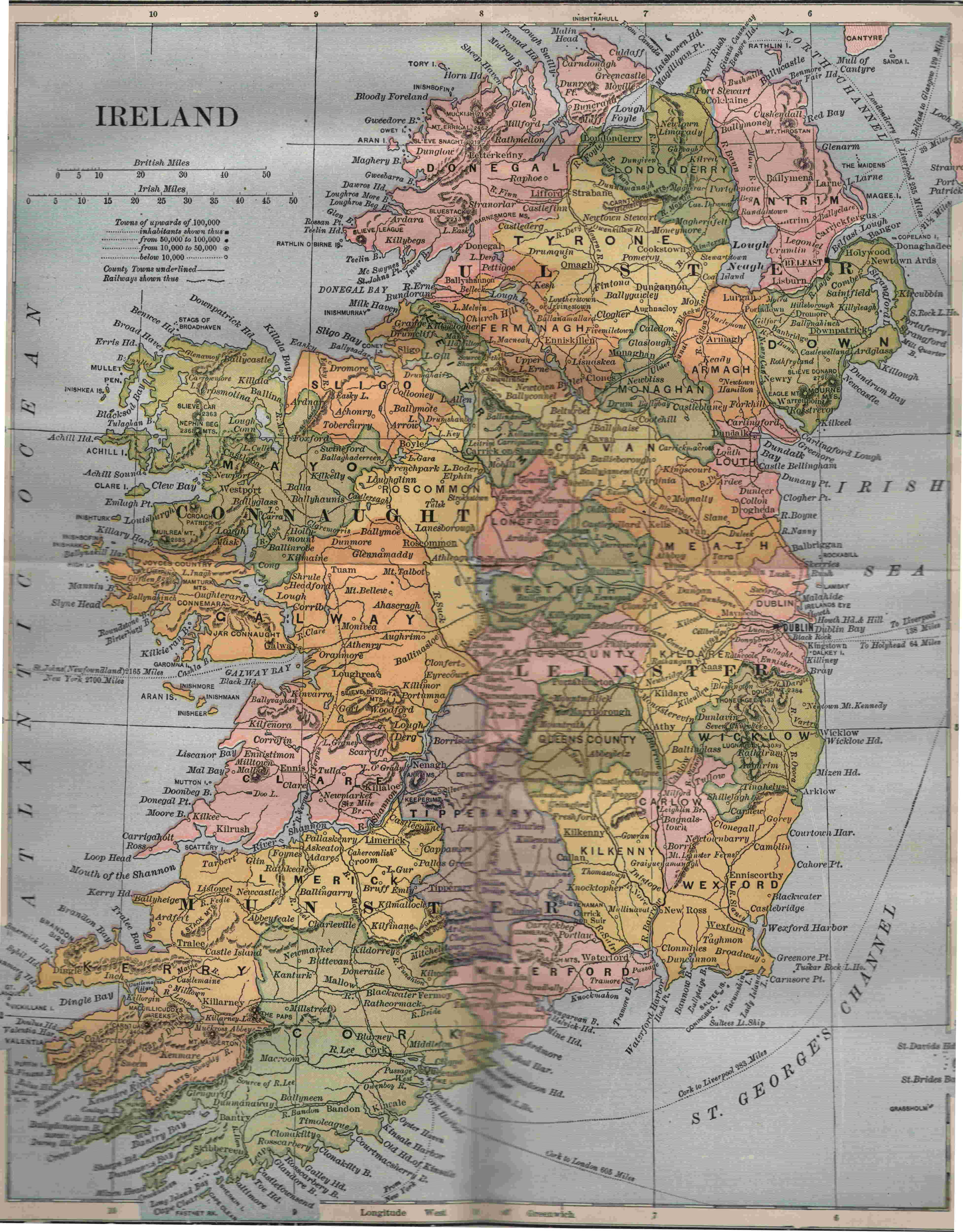 Ireland, called poetically, because of its perennial verdure, the Emerald Isle, lies in the Atlantic Ocean, immediately westward of the larger island of Great Britain, from which it is separated by, in most parts, a wide and deep strait, varying in width from 14 miles, where the headlands of Antrim approach the western coast of Scotland, to about 125 miles, which is the maximum distance from the coast of England. This strait is called, running from north to south consecutively, the North Channel, the Irish Sea, and St. George’s Channel. The high shore of Scotland is always visible, in clear weather, from the northeast coast of Ireland, and the mountains of Wales, about 65 miles distant, may be seen, under similar conditions, from Bray Head and other points on the Leinster coast, but no part of England can be seen at any time from the Irish shore. Ireland, considered geographically, is of an irregular rhomboidal shape, by some writers compared to an oblong shield, and is situated between Latitude 51° 26´ and 55° 21´ North, and Longitude 5° 21´ and 10° 26´ West, projecting farther into the Atlantic Ocean, to the westward, than any other portion of European soil. Its total area, including many small islands close to the coast, is about 32,500 square miles, or 19,000 less than England, 2,000 more than Scotland, 25,000 more than Wales, and nearly 2,000 less than our inland State of Indiana. Ireland would make, almost to a fraction, thirty-two States the size of Rhode Island, which 6has a Legislature of its own—a privilege the Green Isle does not, at present, enjoy.