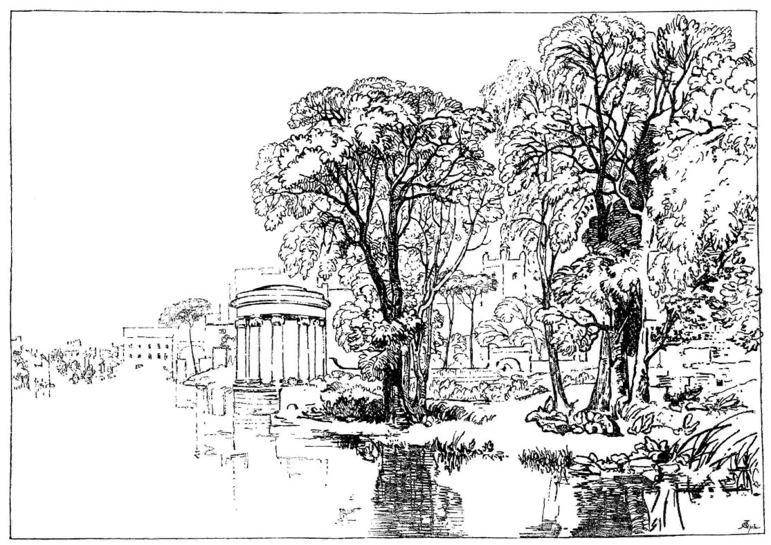 The homeliness of subject in his “Farm behind Scarborough” does not forbid the display of certain of Mr. Holroy virtues. Yet perhaps more characteristic is the “Round Temple,” or that “study of line” suggested by the noble and free beauty of the Borghese Gardens. “Round Temple” is the fuller, the more realized. “Borghese Gardens” consciously and inevitably abandons much that is wont to attract, but it retains the thing for which it has existed—dignified and expressive rhythm of line. And this justifies it, and permits it to omit much, and only to exquisitely hint at the thing it does not actually convey.{89}