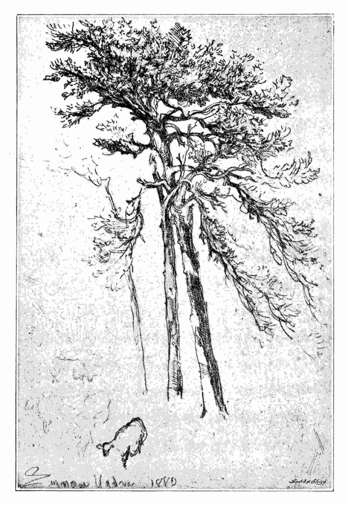 SEVERAL years before Mr. Whistler etched at all—in 1843 and 1844 indeed—a now veteran artist, President “de sa propre Académie,” who has been famous surgeon as well as famous etcher—founder of the Royal Society of Painter-Etchers, energetic advocate, by speech and writing, of the art he loves—drew delicately upon six tiny plates what were meant to be the beginnings of landscapes in mid-Italy. As rare as anything in Mr. Whistle long œuvre—though, as their author knows, in themselves far less desirable—are the impressions of those little plates, which few have seen, but which I beheld, perhaps ten or twelve years ago, strengthened here and there with pencil-work, yet even then only feebly holding their own, among the abundant treasures of an upper chamber in Hertford Street—the almost unknown initial chapter, they, in the sturdy and now celebrated volume of Seymour Hade etched work.{46}