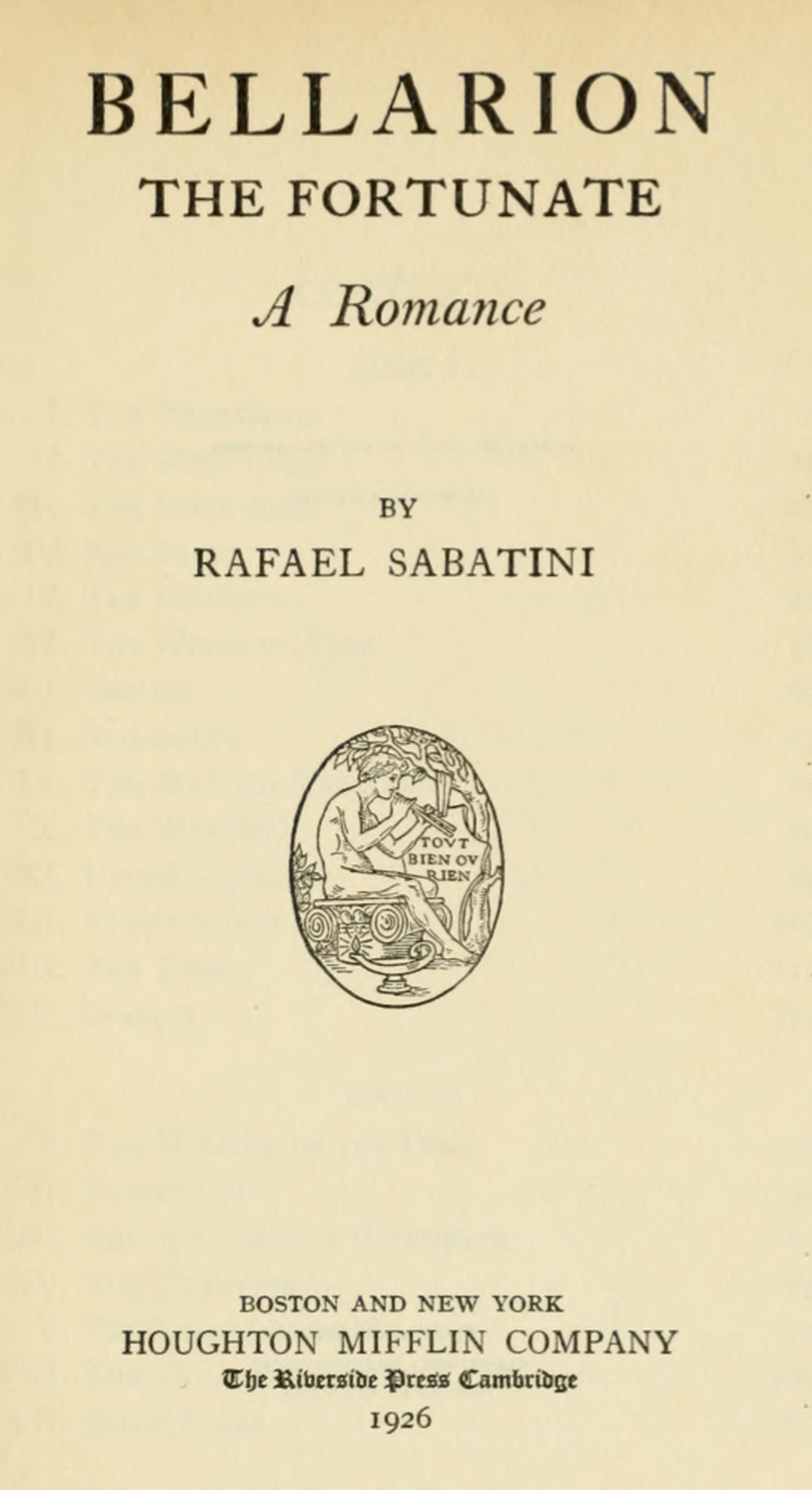 The mischief began—and you may account it symbolical—by his losing his way. This happened a mile or two beyond the township of Livorno. Because the peace of the riverside allured a mind that for seventeen years had been schooled in peace, because the emerald meadows promised to be soft and yielding to his feet, he left the dusty highway for the grassy banks of Po. Beside its broad waters winding here about the shallow, pleasant hills of Montferrat, Bellarion trudged, staff in hand, the green hood of his cape thrown back, the long liripipe trailing like a tail behind him, a tall, lithe stripling of obvious vigour, olive-skinned, black-haired, and with dark eyes that surveyed the world bold and fearlessly.