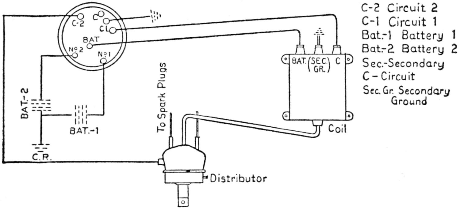 A. The spark and the throttle levers should be placed in the same position on the quadrant as when cranking by hand, and the ignition switch turned on. Current from either battery or magneto may be used for ignition. When starting, especially when the engine is cold the ignition switch should be turned to battery. As soon as the engine is warmed up, turn switch back to magneto. The magneto was designed to furnish ignition for the Model T engine and better results will be obtained by operating in this way. Special attention must be paid to the position of the spark lever as a too advanced spark will cause serious backfiring which in turn will bend or break the shaft in the starter. The starting motor is operated by a push button, conveniently located in the floor of the car at the driver’s feet. With the spark and throttle levers in the proper position, and the ignition switch turned on, press on the push button with the foot. This closes[329] the circuit between the battery and the starting motor, causing the pinion of the Bendix drive shaft to engage with the teeth on the flywheel, thus turning over the crank shaft. When the engine is cold it may be necessary to prime it by pulling out the carburetor priming rod, which is located on the instrument board. In order to avoid flooding the engine with an over rich mixture of gas, the priming rod should only be held out for a few seconds at a time.