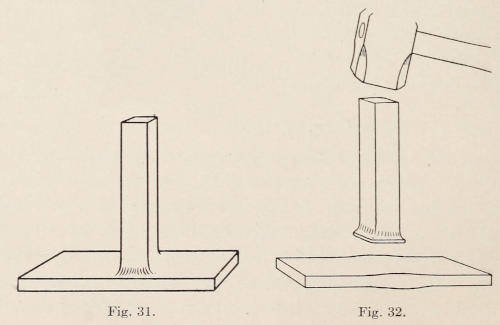 Iron and steel are sometimes smoothed with a tool called a flatter. This tool is struck on with a sledge, and should not be used to stretch iron. Its purpose is only to give the work a smooth finish. Figure 13 shows a flatter, and Figure 14 a set-hammer. The set-hammer is always used to smooth and draw stock. All of these tools are made from tool-steel.