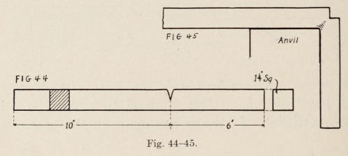 The stock used in a forge shop should be kept in a rack built for the purpose. The different kinds of stock, such as soft and tool-steel, common and Swedish iron, should be partly painted with a distinguishing[18] color, so that there will be no trouble finding what is wanted. For instance, all soft steel should be painted white, tool-steel another color, and so on. There should also be in the shop a shears to cut iron. One of the ordinary hand-power shears in use today would be suitable and may be purchased from a dealer.