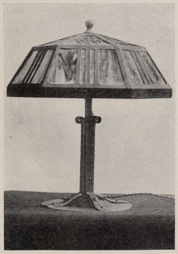 In Figure 80 is represented a portable lamp. This kind of lamp can be made in various sizes with one light. The lamp shown in the illustration, consists of two parts; the standard, and the shade, which can be removed. The standard consists of a box-shaped bottom, with a pipe screwed into it for the upright piece. The arms that the shade rests on, are separate[140] and are held in position by the lamp socket, which is screwed down on them. The strips running over the bottom of the base and up the pipe are riveted in place to support the pipe. This gives the whole standard a more substantial appearance, and relieves the plain round pipe.