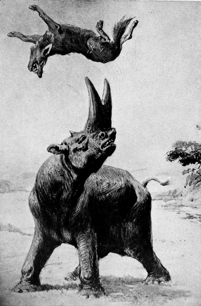 Arsinothere of three million years ago impaling a carnivorous creodont, somewhat resembling a hyena.
