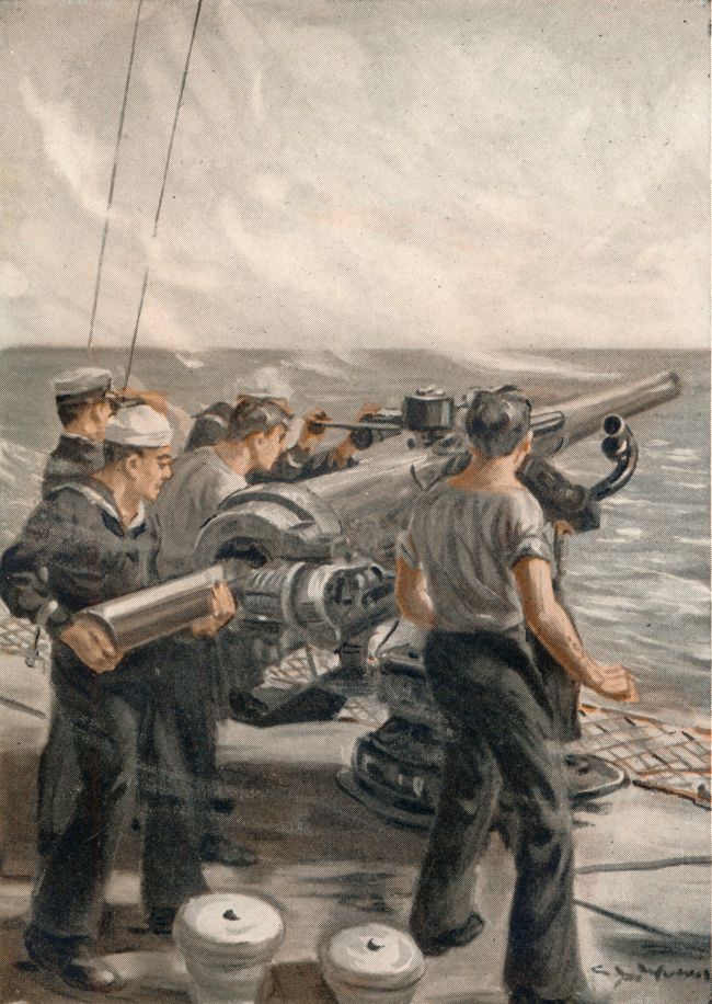 As there had come no further message it was feared that the merchantman, the American “Three L” liner Antietam, had been forced to surrender. At seven-thirty the General Quarters alarm sounded and the crew went to stations. A few minutes afterwards the foretop lookout reported smoke one point off the starboard bow and presently a deck lookout reported “something to port, sir, low on the water! Might be the sub!” A moment’s search from the bridge and then, over the fire control system sped range and deflection.