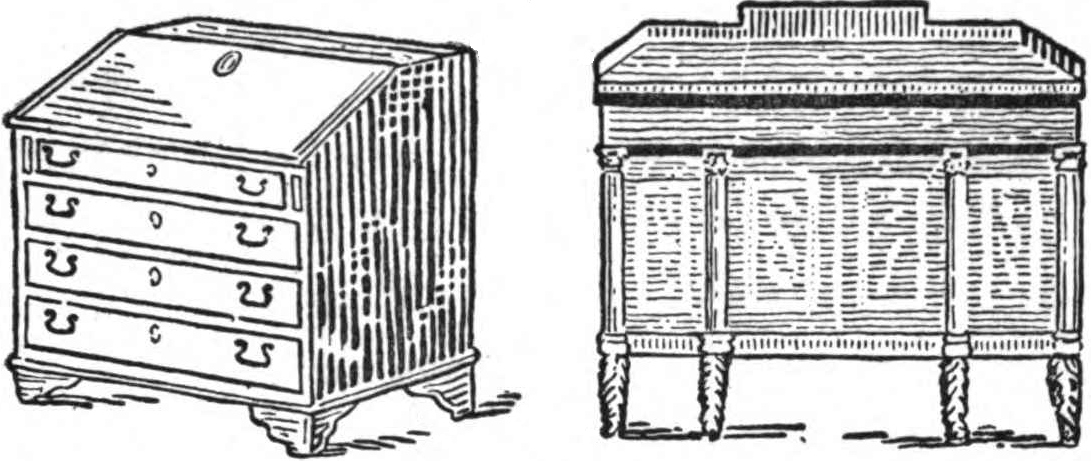 Professor Milton Kilgallen had planned to devote his life to entomology. Fortunately for all antique-lovers, his first researches were made among the borers. This chance brought him in close contact with antiques; since it is among the antiques that[xiv] many of the wood-borers seem best able to function and to express their individuality. Although he has never lost interest in the borers, his early love for entomology has been abandoned in favor of his second love, antiques. He has devoted himself to the study of antiques with the enthusiasm which has always characterized the activities of the Kilgallen family. His tall, somewhat wooden figure and his rich mahogany-colored features—due, probably, to his somewhat eccentric but constant use of furniture polish as a face lotion—are familiar to antique-dealers from Odessa to Otaru and from Edinburgh to Eski-Shehir. His knowledge of antiques verges on the supernatural. Other antique-collectors cannot account for it; but he himself ascribes it to a trimonthly subcutaneous injection of the special furniture polish from his own laboratory. With the charming simplicity that always characterizes his speech and acts, he declares that if one wishes to place himself en rapport with an Indian, one lives like an Indian; if one wishes to familiarize himself with the gorilla, one lives the life of a gorilla as nearly as possible. If, therefore, one wishes to become thoroughly familiar with furniture, one must live like[xv] furniture: that is to say, he must think like furniture. The whimsical directness and incontrovertibility of this suggestion is typical of the man; and if we are to believe him, it accounts for his penetrating knowledge of all sorts of furniture. Other collectors have tried the same system, but most of them either went blind or lost their reason.