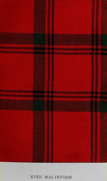 The extensive variations in the tartans styled Mackintosh are attributable to the fact that Clan Chattan embraced many septs, more or less nearly allied, who changed the pattern at will. But the chief’s and the clan designs are now accepted as authoritative examples of the early scheme. To the example here illustrated peculiar interest attaches, since it is the sett worn by Prince Charles Edward in the Mackintosh country. The Rev. A. Thomson Grant, of the Rectory, Leven, from whom the specimen was obtained, writes: “The piece of tartan I sent you was given me in September 1860 by Mrs Christina Mackintosh or Grant, widow of the Rev. James Grant, minister of Cromdale. I was at the time on a visit to Coulnakyle House, some miles above Grantown, where Mrs Grant and her family then resided. Mrs Grant produced a piece of tartan, which she confidently assured me was a piece of the kilt worn by Prince Charlie while in the Mackintosh country. The kilt, she added, was religiously divided among the then members of the chief’s family and near relations, and the piece she possessed had come down to her by regular descent from her ancestors of that time. When I was bidding good-bye, Mrs Grant halved the piece of tartan, and gave me that which is now in your possession.” The illustration reproduces the colours and the dimensions in the original, which, though a small, is yet a fine specimen of old hard tartan.