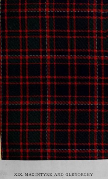 Wherever authentic records of tartans are preserved this design appears, generally as Mac Intyre and Glenorchy, though occasionally as Glenorchy alone. It seems to have partaken of the nature of a district tartan, for the locality whence the title is taken was only partly occupied by the Mac Intyres, who appear never to have attained the strength of a clan. No Mac Intyre arms are matriculated in the Lyon Register. They are found, however, in Burke’s General Armoury, and the individual contributing them evidently regarded his family as a sept of the Mac Donalds. The pattern in the illustration occurs in the collection of the Highland Society of London (1822), and in reproductions made in Edinburgh about 1820 from examples of ancient designs procured in the Highlands near that time. In a collection formed in 1790 there is a scheme differing very slightly from the present illustration. Of the antiquity of the name Mac Intyre in Lorn evidence is furnished by the traditions of a family who “possessed the farm of Glenoe, in Nether Lorn, from about the year 1300 down to 1810. They were originally foresters of Stewart, Lord Lorn, and were continued in their possession and employment after the succession of the Glenorchy and Breadalbane families to this estate, by a marriage with a co-heiress of the last Lord Lorn of the Stewart family in the year 1435” (Stewart’s Highlanders, third edition, Vol. I. p. 82). General Stewart, writing in 1822, observes: “In like manner the Athole, Glenorchy, and other colours of different districts were easily distinguishable.” Doubtless this statement refers to the example here given, because it is shown in all collections of importance gathered at that date, when what is now commonly known as the Mac Intyre appears to have been non-existent.