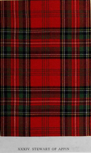 For the source of the present illustration reference must be made to the notes on the Stewart of Atholl tartan (Plate XXXIV.) The pattern is identical with the Royal Stewart as now worn, except that the present sett has four narrow green lines running through the large red squares. In the Grameid (pp. 142-3) it is stated, in connection with Dundee’s gathering at Lochaber in 1689, that “brave Stewart of Appin, ... with the whole body of his clansmen, leaves the shores bordering Leven, ... carrying blue banners charged with yellow figures, ... and wearing on their lofty heads fur bonnets.” The passage, unlike portions dealing with other clans, contains no mention of the tartan colours. During the ’45 the Appin Regiment bore itself gallantly for the Prince. The roll of the killed and wounded in the campaign supplies interesting evidence of the variety of minor septs often included in the larger clans. It is compiled from memoranda made by Charles Stewart, nephew of Fasnacloich, Captain in the Highland Army, and sometime Quartermaster-General and Secretary to Prince Charles Edward. The list is as follows:—