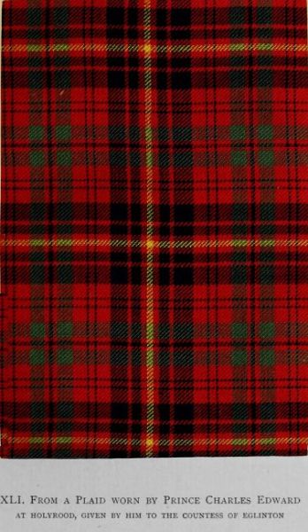 The fragments employed in the preparation of this illustration are portions of a plaid worn by Prince Charles Edward during his brief sojourn in Edinburgh in 1745. On his departure he presented the garment to Susanna, Countess of Eglinton, a belle of the day, at whose house in the Canongate he was a frequent visitor. Divided by her among her seven daughters, a portion was given by one of them—Lady Frances Montgomerie—to her grand-niece, the late Mrs Erskine of Torrie, who bequeathed it to the Rev. Henry Bruce, Dunimarle. Mr Bruce mentions that Mrs Erskine, who assured him of the genuineness of the relic, spoke of Lady Frances as having often conversed with the Prince. Well-nigh a century back the tartan was cut up for slippers by the daughters of Sir William Erskine of Torrie. It was thus greatly mutilated, but enough remained intact to permit the rendering of the design here given. Sir Arthur Halkett, Bart., in whose collection are some small pieces of the plaid, lent these to ensure the reproduction of the precise tints of the original.