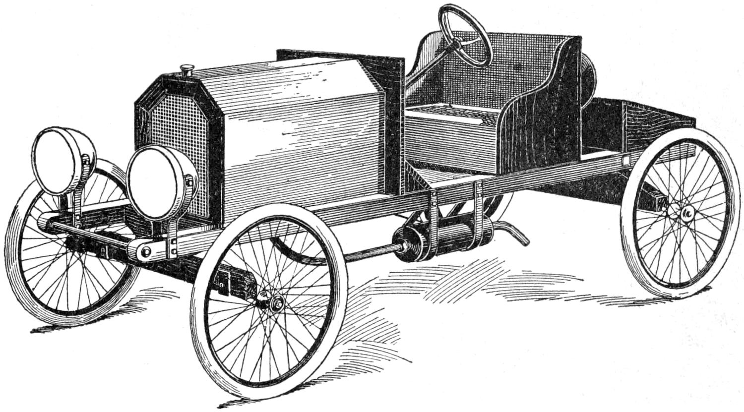 The lighting arrangement may next be installed, gas or electric lamps, run on batteries, being used. Mudguards are desirable if the car is to be used on muddy roads. Strong bicycle mudguards can be installed, the guard braces being bolted on the axles. A strong pipe, with a drawbolt passing through its length, is mounted across the front of the frame. The body is built of ⁷⁄₈-in. stock, preferably white wood, and is 2 ft. 4 in. wide. A priming coat should be applied to the woodwork, followed by two coats of the body color, and one or two coats of varnish. The metal parts, except at the working surfaces, may be painted, or enameled.