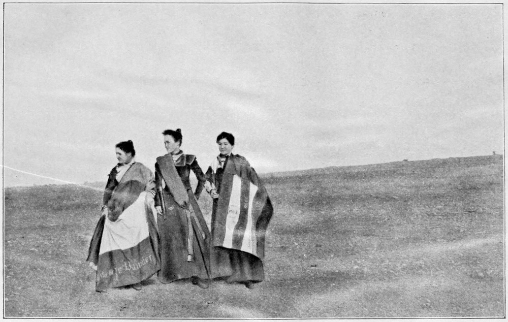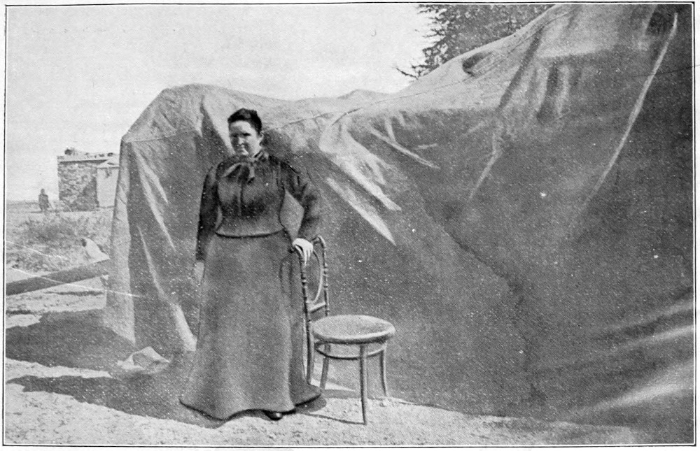 One of the three ladies standing up (in the accompanying photograph) is my daughter, now Mrs Ferreira; the other two are two Misses Bezuidenhout. They have there the very flags of the Transvaal and Orange Free State, which are their great treasure.[Pg 135] The two Misses Bezuidenhout are the daughters of the Widow Bezuidenhout, my husband’s eldest sister. She is the mother of nine children; she too had her house burned down and all that she possessed taken away from her. I have often found her in tears, and she would say to me, “What is to become of us all? I and my children have not one single animal left alive, and everything on my farm has been destroyed!”