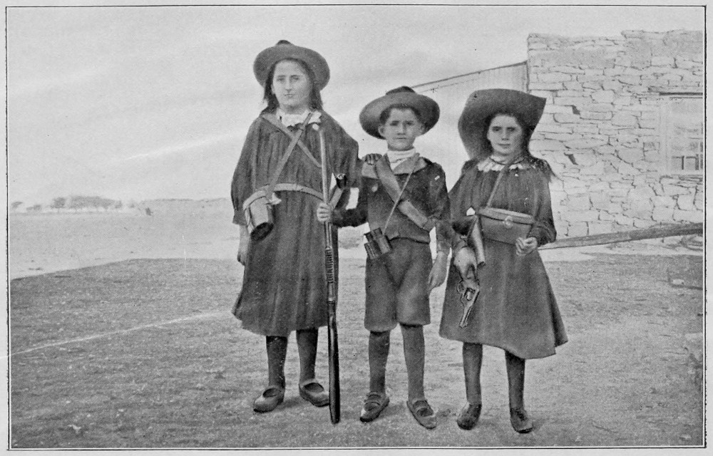 Here are also three more of my children, the three youngest. The little boy in the middle, Gabriel Johannes, is now six. He often used to say to the English soldiers, “Hands up,” and then they would laugh at him. It was a pleasure to him to be flying away; whenever we had been long in one place, he would say, “I wish we had to run away again; not from the ‘khakis,’ but just so as to be driving.” When he heard that the burghers had to give up their arms, he said, “I am not going to give my gun to ‘khakis’; I would[Pg 140] rather break it in pieces; the ‘khakis’ shall never have it.” There he has it in his hand. It was such a momentous time, even the youngest felt the weight of it.