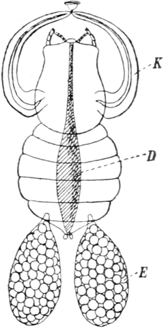 Über die Befruchtungserscheinungen am Eie hat Weismann[122] eine Reihe gründlicher Untersuchungen angestellt. Die Wasserflöhe verlassen das Ei in einer Gestalt, welche der der erwachsenen Tiere schon sehr ähnlich ist, machen also kein freilebendes Cyclopsstadium durch.