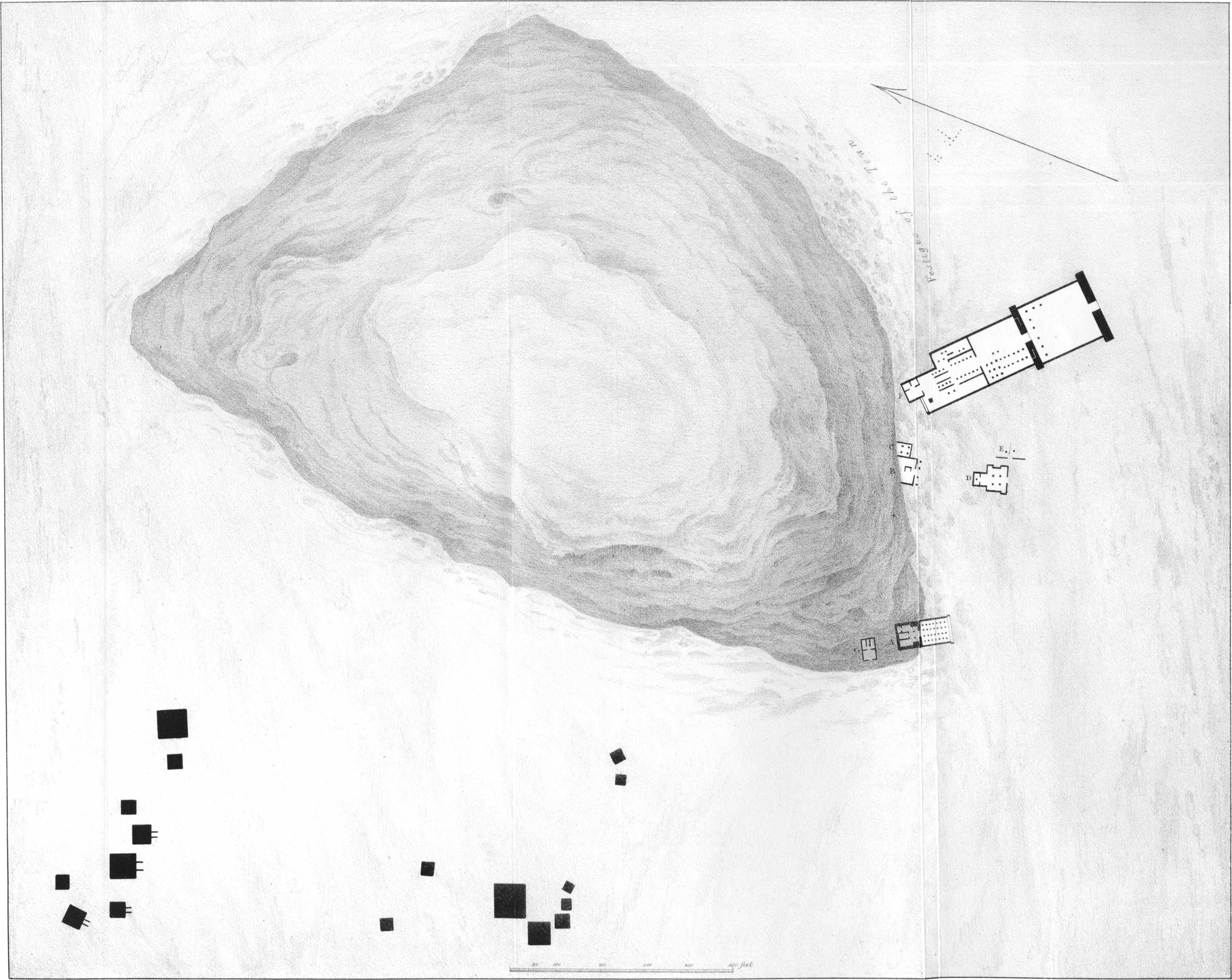[27]The generality of the pyramids face a little to the south of south-east. I regret to state, that, from an error of the engraver’s, which I did not discover until all the copies were printed off, their direction is not correctly marked in the General Plan; but, as their position is accurately shown in the above vignette, I have considered it unnecessary to incur the expense of having the plate reprinted.
