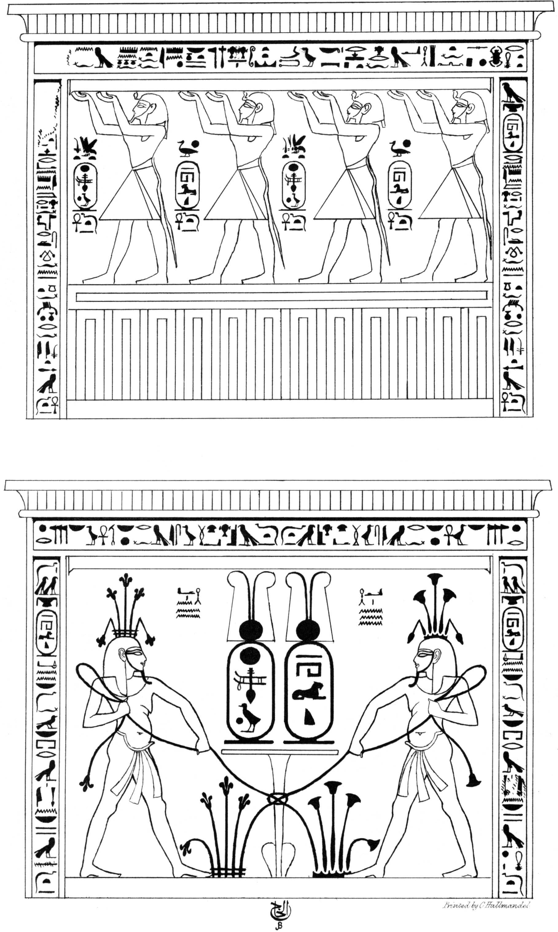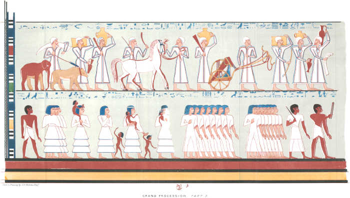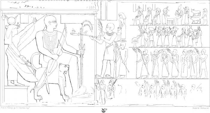 [85]I regret that in some few of the impressions the caps were printed black. The reader must be aware, that the management of such engravings as these is excessively difficult. Four colours are impressed from separate stones—red, blue, black, and the ground. The others were put in by hand. I took great pains in superintending the mixing of the colours, to give the reader as exact a representation of an Egyptian painting as was in my power. I am indebted to Mr. Bonomi for having drawn for me on the stones these and the other plates of sculpture.