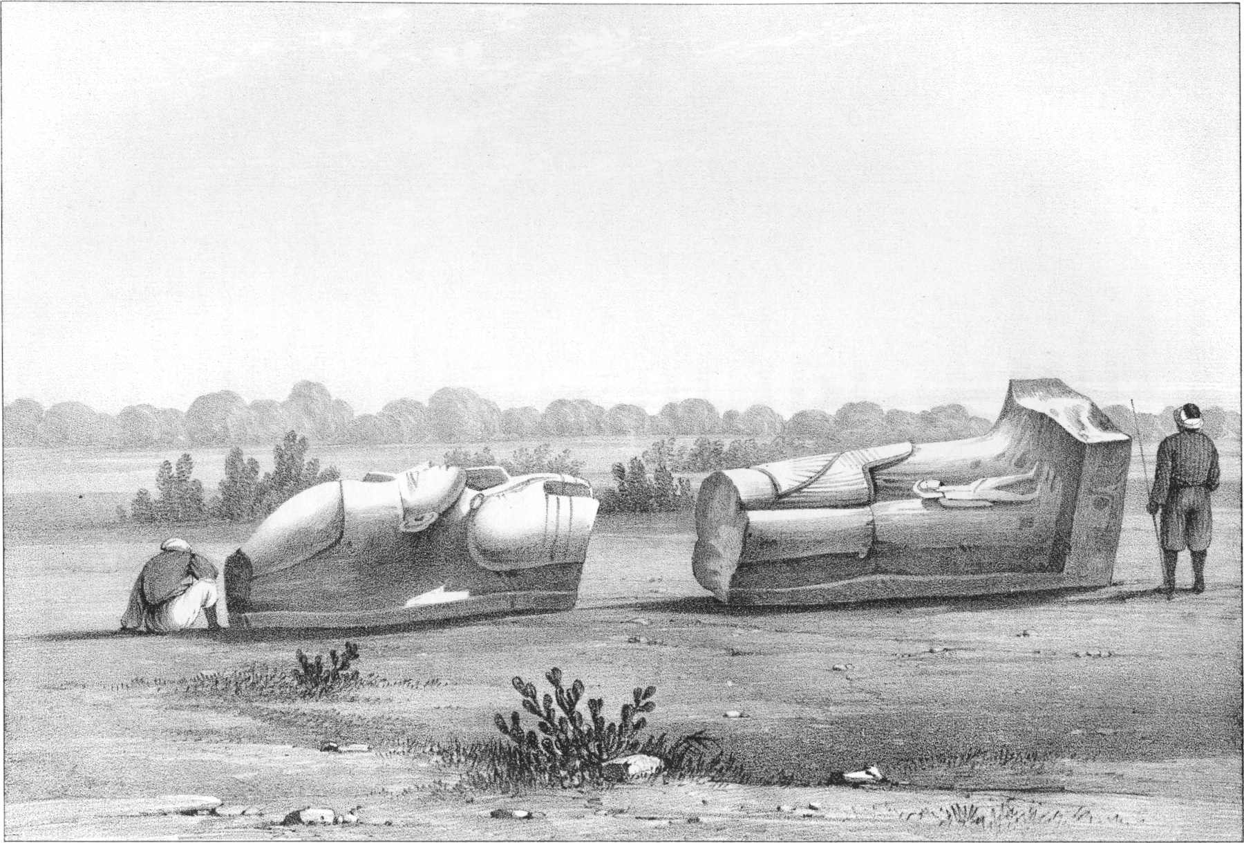 [24]In crossing this desert, to save anxiety, I gave each person his own provision of water to take care of, warning him, if that fell short, it was his own fault. This plan succeeded, each individual taking such care of his skins that none of them ran out.