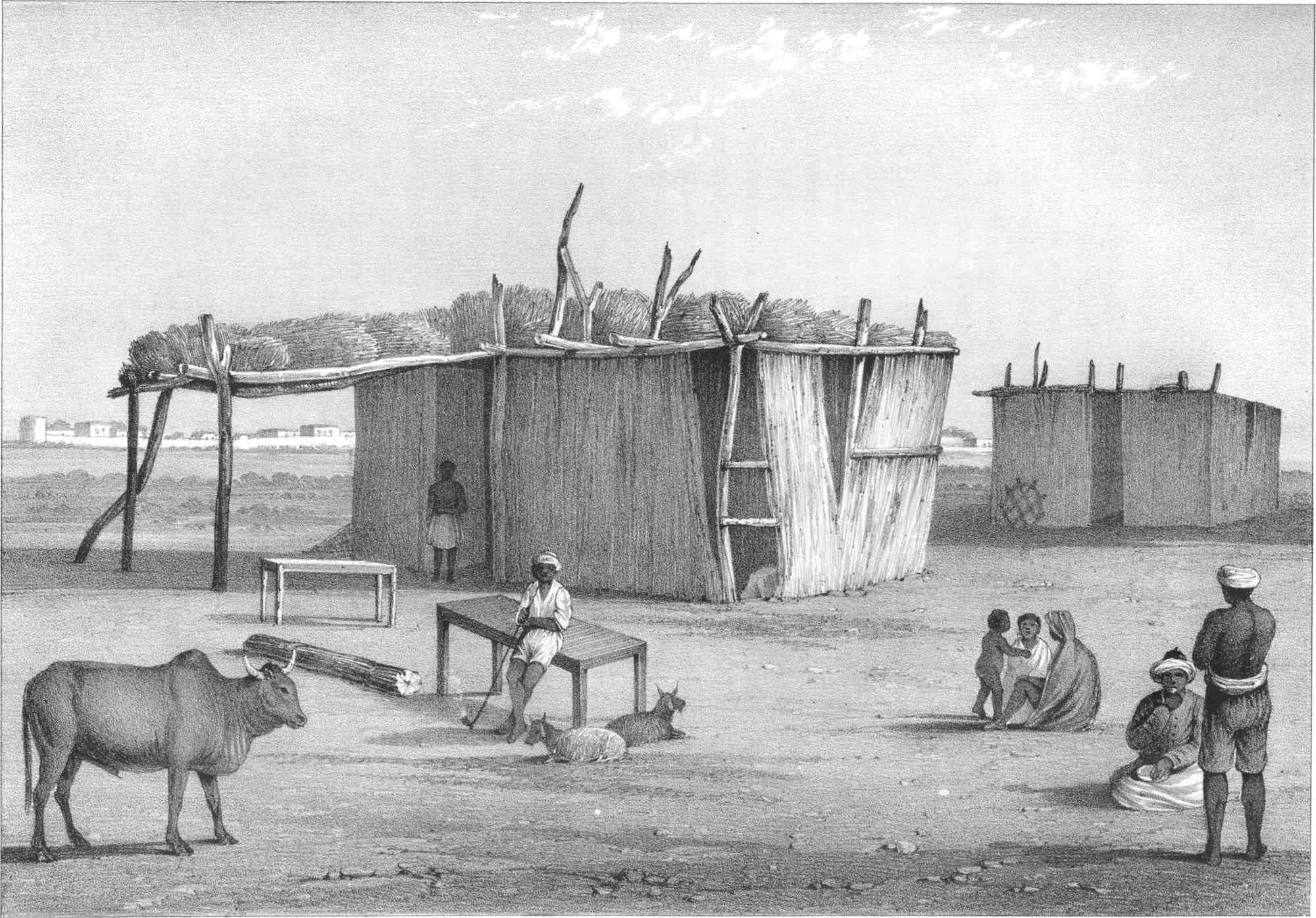 [44]“Le 17 Avril nous eûmes occasion de voir à Beit el Fakih un exemple du sangfroid et de la fermeté des Arabes. Le feu prit à une maison à l’extrémité méridionale, et, comme le vent soufflait du sud avec violence, en peu de tems la plus grande partie de la ville fut dévorée par les flammes: cependant les habitants restaient tranquilles: on n’entendait dans les rues ni cris, ni lamentations; et quand on plaignait leur sort, ils répliquaient, C’est la volonté de Dieu. Nous occupions une maison de pierre dans un quartier que les flammes épargnèrent: montés sur notre toit nous vîmes les toits des autres maisons, remplis de spectateurs, qui regardaient tranquillement l’incendie. Un savant pauvre, qui nous rendait souvent des visites, vint à nous voir après avoir mis en sûreté ses effets, et nous indiqua d’un air indifférent le moment où sa maison s’embrasa.”