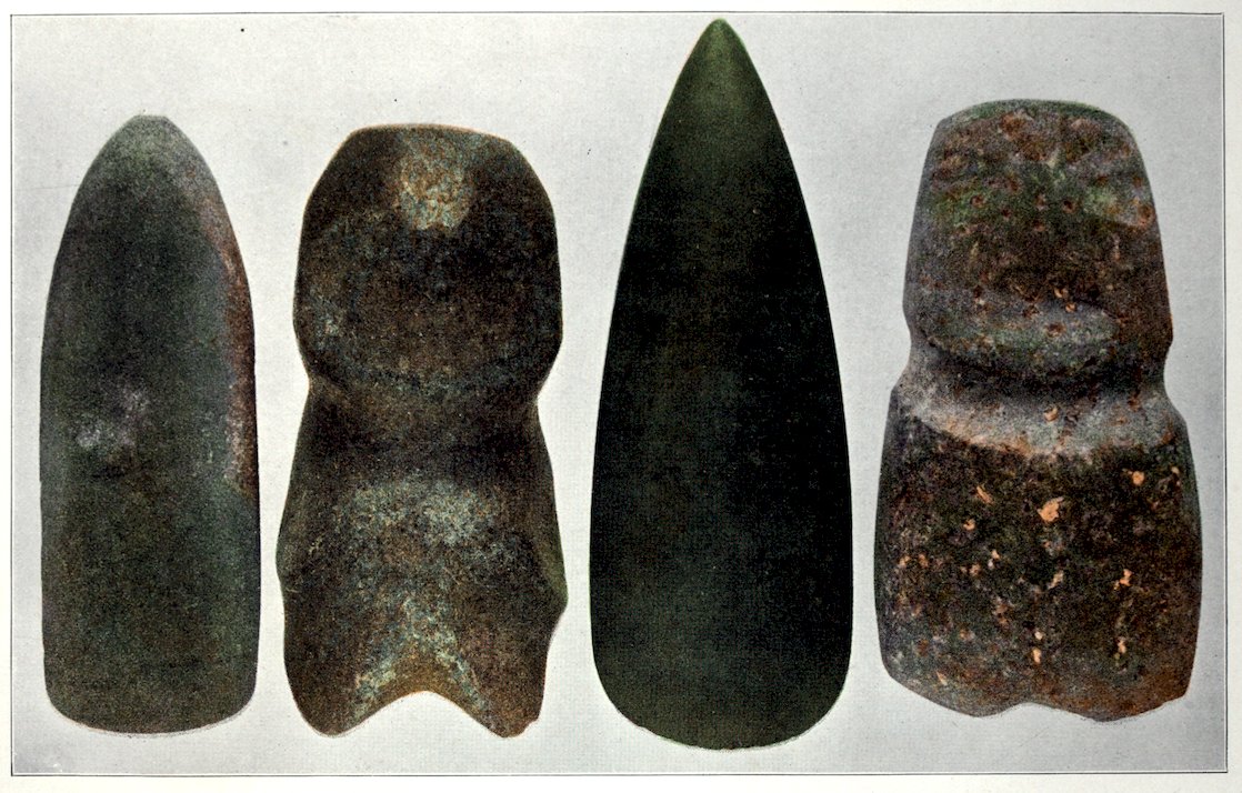 Two grooved effigies and two celts, from the Bahama Islands, West Indies. Reproduced in natural colors. B. W. Arnold’s collection, Albany, New York.