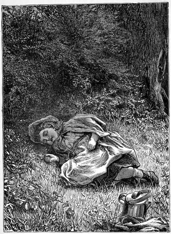 The prince followed it, and taking off his crown, he hung it on the tree; then he lay down by the brook and went to sleep, while the goose crouched 12down beside him, and the eleven other geese stayed a little distance off, none of them allowing a soul to pass them.