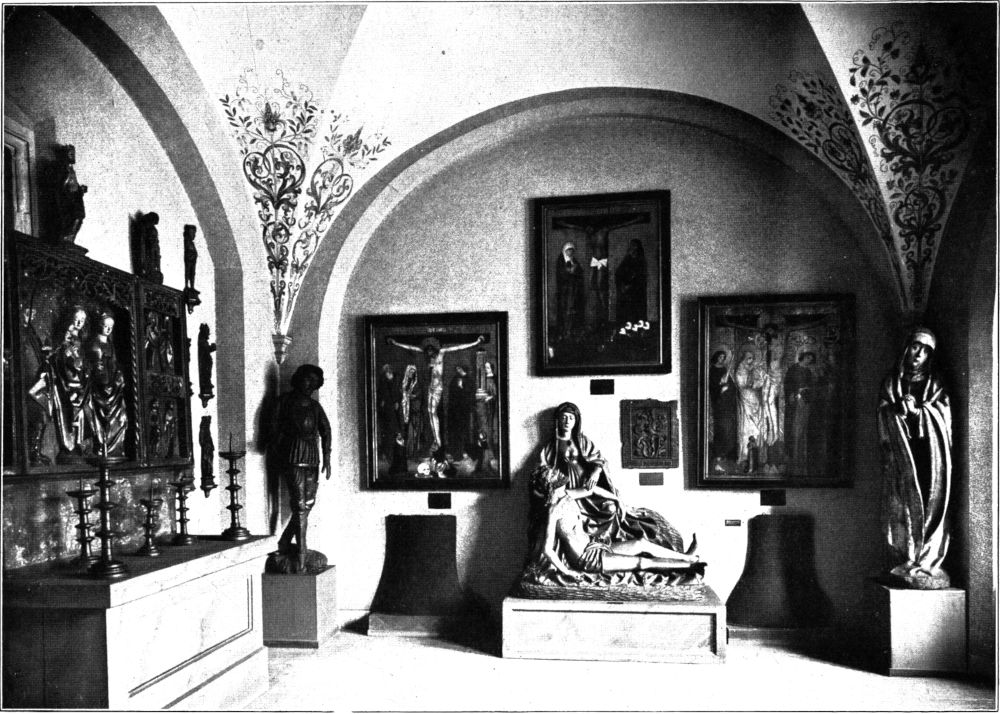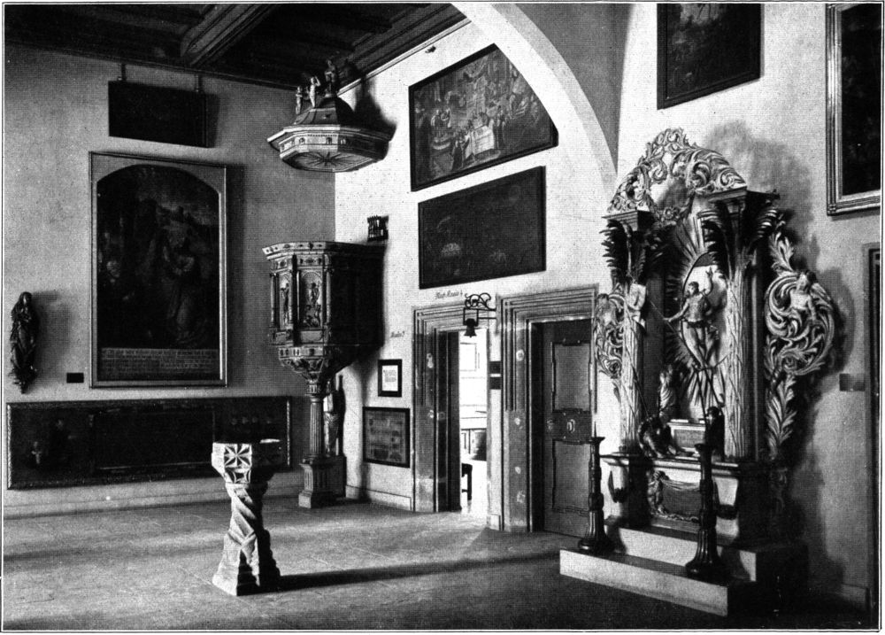 Die Paulinerkirche, die mitsamt dem umfangreichen Gebäudekomplex des dazugehörigen Klosters nach dessen Säkularisation 1543 an die Universität kam und seitdem als Universitätskirche dient, hat ihren letzten Umbau zusammen mit dem Neubau der Universitätsgebäude in den neunziger Jahren des[311] vergangenen Jahrhunderts durchgemacht. Sie ist dabei im Inneren ihrem allgemeinen Charakter nach eine spätgotische Hallenkirche von etwas kleineren Dimensionen mit drei Schiffen und einem dreigeteilten Chor geblieben. Auch die Einzelformen, die sie durch die zwei letzten Bauperioden der Dominikaner erhalten hatte (um 1485 und 1520), sind im allgemeinen erhalten worden. Für die Beleuchtungsverhältnisse und die Raumwirkung des Langhauses ist es von[312] Bedeutung, daß, wahrscheinlich im sechzehnten Jahrhundert, das obere Stockwerk über dem an die Südwand der Kirche anstoßenden Kreuzgangflügel als Erweiterung der rechten Empore in den Kirchenraum einbezogen worden ist. Die Emporen, die das Schiff auf drei Seiten umrahmen, stammen in ihrer heutigen Gestalt aus dem Beginn des achtzehnten Jahrhunderts, die prachtvolle geschnitzte Kanzel in frühem Rokoko aus dem Jahre 1738.