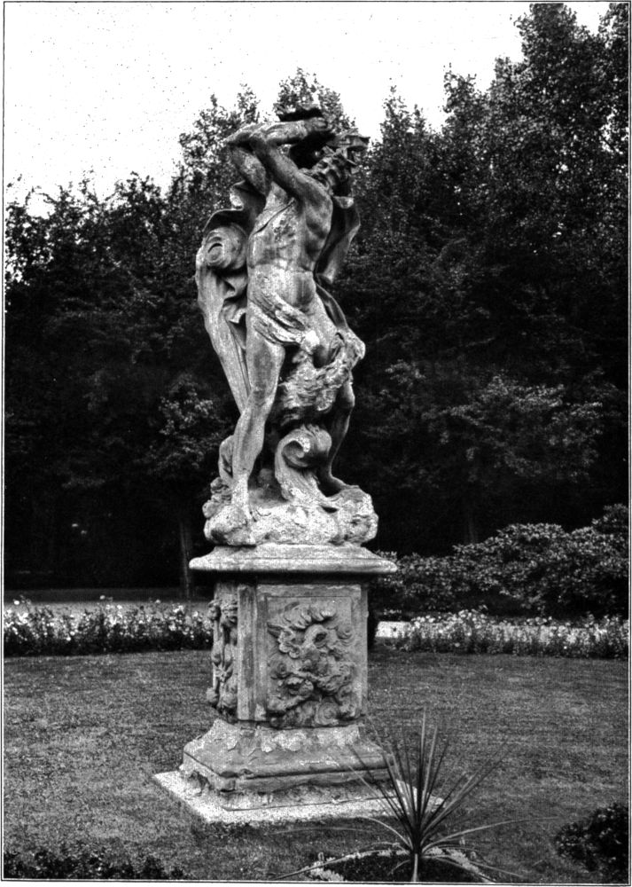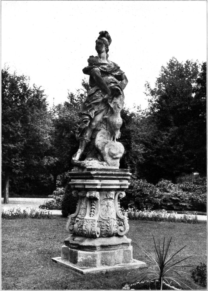 Die vier Götterfiguren in Leipzig haben zum Teil schwere Schicksale erlitten, die wohl nicht zum wenigsten der verständnislosen Geringschätzung zuzuschreiben sind, die lange Zeit der Kunst des Barock entgegengebracht wurde. Jupiter und Juno standen noch lange in der Nähe ihres ursprünglichen Standortes, im Vorgarten des Sophienbades in der Otto-Schill-Straße. Als das Bad im April 1922 abgebrochen wurde, ließ der Rat beide Figuren nach dem Palmengarten überführen, wo sie eine Aufstellung gefunden haben, die ihrer ursprünglichen Bestimmung jedenfalls näherkommt als es an dem bisherigen Platze der Fall war. Die beigegebenen Aufnahmen zeigen ihren jetzigen Stand. Im Sommer bei belaubtem Baumhintergrund ist ihre Wirkung am günstigsten. Jupiter schleudert mit großer Anstrengung seinen Blitz. Sein Adler sitzt auf einem Gebilde, das eher versteinerter Meeresbrandung als einer Wolke gleicht. Juno mit ihrem Pfau in majestätischer Haltung, mit wallendem Gewande, das sie kokett rafft, um dem Beschauer anzudeuten, welche Formen sich dahinter verbergen. – Zwei treffliche Beispiele barocker Bildnerei. Von der Venus wußte man, daß sie im Erdreich des Vorgartens in der Otto-Schill-Straße schlummerte, seitdem ein Sturm sie vom Sockel geworfen hatte. Ich ließ sie freilegen, fand aber leider einen Torso, der die Reize der Liebesgöttin kaum mehr ahnen ließ. Der Sockel fehlte ganz, es war nichts hinüber zu retten. Der Mars in mittelalterlicher Rüstung führte bisher in einem Lagerschuppen hinter[269] dem alten Johannishospital kopflos ein verschwiegenes und unrühmliches Dasein. Gesicht und Helm sind bis zur Unkenntlichkeit beschädigt. Besser ist der kapitälartige Sockel erhalten. Ohne eine weitgehende Ergänzung dürfte eine Wiederaufstellung nicht denkbar sein. Ob sich in unserer Zeit ein pietätvoller Retter findet?