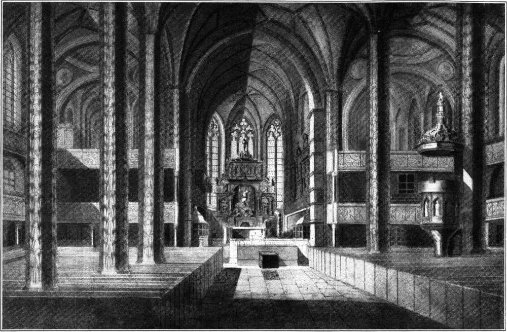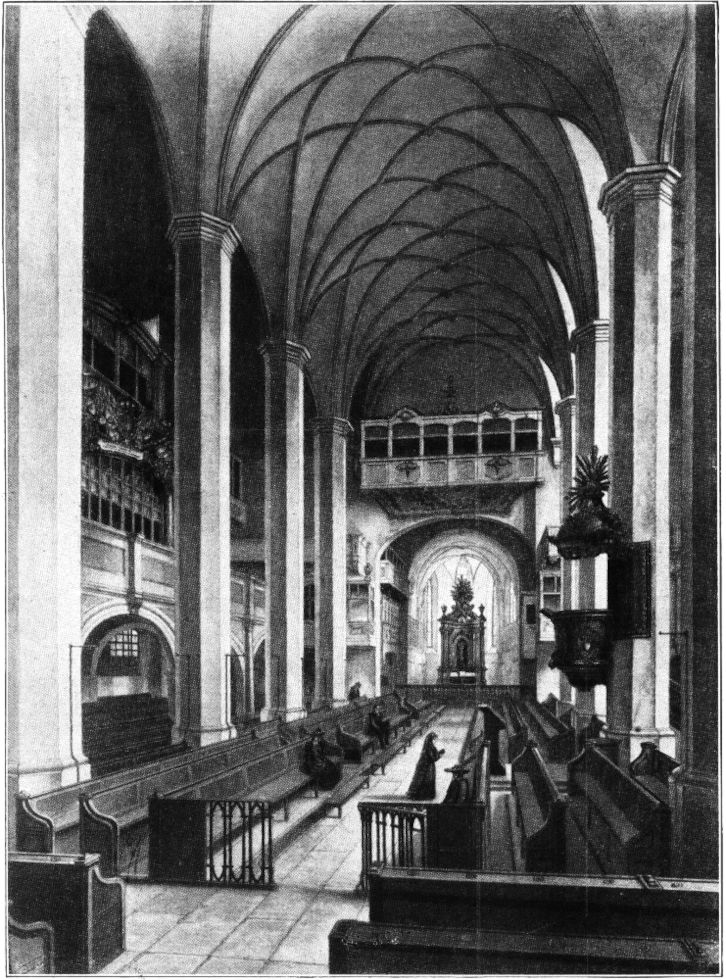 Das achtjochige Langhaus ist nach einem einheitlichen Plane von 1483 bis 1496 dem eigentümlich verkümmerten Querschiff und dem niedrigen einschiffigen[308] Chor aus einer etwa siebzig Jahre früheren Bauperiode vorgelegt worden, die gegen das Langhaus schief orientiert sind. Dieser ältere Bauteil wirkt als eine dunkle Masse, da er sein Licht nur durch die nicht besonders hohen, heute zudem mit dunklen Glasbildern versehenen Fenster im fünfeckigen Chorabschluß erhält. Von dem Aussehen der Kirche in katholischer Zeit werden wir uns heute schwerlich mehr ein Bild machen können, da von ihrer inneren Ausstattung, wie auch von der Ausschmückung der Kapellen, die an die Seitenschiffe anschließend, noch bis zur Zeit des letzten Umbaus standen, das Meiste längst verloren ist. Im siebzehnten und achtzehnten Jahrhundert hatten sich über den Emporen und sogar über dem Triumphbogen vor dem Chore balkonartige Logen von den verschiedensten Formen eingenistet, die ein sehr malerisches Bild geboten haben müssen, allerdings zum Teil die Seitenschiffenster verdeckt haben werden. Die moderne puristische Restauration hat damit aufgeräumt. Dadurch ist eine gewisse freudlose Nüchternheit in die alte Kirche eingezogen – bekanntlich das Schicksal vieler alter Kirchen in protestantischen Gegenden. Die prächtigste Loge, der 1683 zur Erinnerung an die Türkensiege Kurfürst Johann Georg III. über der linken Seitenempore aufgebaute »Fürstenstuhl« ist sogar noch 1889 abgebrochen worden, »weil er in den Stil der Renovation nicht paßte.« Er konnte aber später wenigstens Aufnahme im Stadtgeschichtlichen Museum finden.