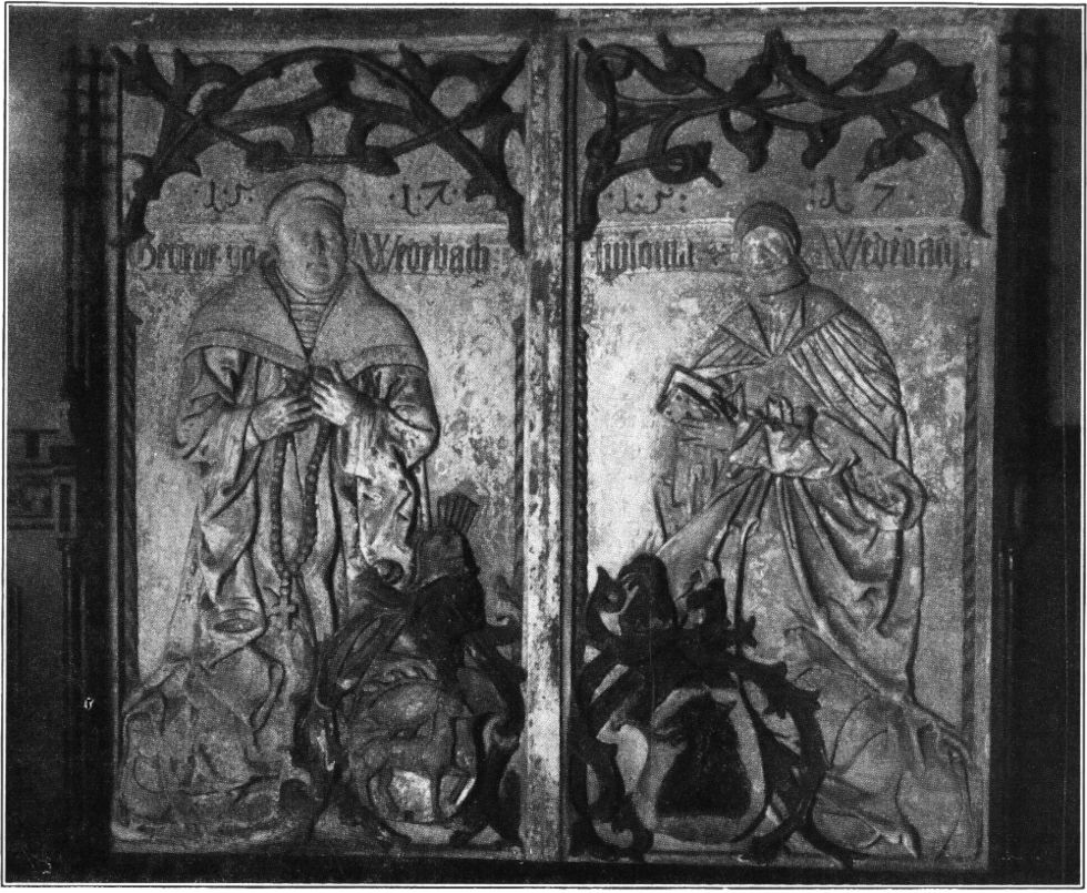 Vor der Reformation war der Chor durch einen schlicht gehaltenen gotischen Lettner abgeschlossen, wurde aber bei Einrichtung der Kirche für den protestantischen Kultus gegen das Langhaus zu geöffnet. Damals ist auch der[315] gerade erst wenige Jahrzehnte zuvor auf den Zwinger der Stadtmauer herausgeschobene Chorabschluß beseitigt und durch eine einfache Wand mit einem großen Fenster ersetzt worden. Die an die linke Seitenschiffwand angebauten Kapellen sind zu Beginn des neunzehnten Jahrhunderts abgetragen worden,[316] und die zahlreichen Epitaphien von Angehörigen der Universität, sowie einige Denkmäler aus der Periode der Dominikaner hat man darauf zum Teil im Kreuzgange aufgestellt, zum Teil aber, so gut es ging, an den hohen Schranken[317] angebracht, die den Hauptchor von den Nebenchören trennen. Dort bieten sie sich aber, in enger Folge aneinandergedrängt, dem Beschauer nicht allzu günstig dar. Das ist um so bedauerlicher, als sich unter ihnen hervorragende Werke aus fünf Jahrhunderten befinden, die mehr als lokales Interesse beanspruchen dürfen, angefangen von der buntbemalten hölzernen Statue des 1307 in[318] Leipzig ermordeten Markgrafen Dietzmann, die mit dem heute vor dem rechten Nebenchor aufgestellten Sitzbild des heiligen Dominikus der bedeutendste Zeuge des hohen Standes der Leipziger Plastik im vierzehnten Jahrhundert ist. Aus den folgenden Jahrhunderten stammen schöne bronzene Grabplatten[320] und Epitaphien in den strengen Formen der Renaissance und daneben in den kühnen, gewaltig bewegten des Barock. Der große Wandelaltar aus dem Beginn des sechzehnten Jahrhunderts ist neuerdings sorgfältig restauriert und ergänzt worden, und sein geschnitzter Hauptteil hat auf dem Altarplatz im Chor seine Stelle gefunden, während man die gemalten Flügel im Nordchor untergebracht hat.