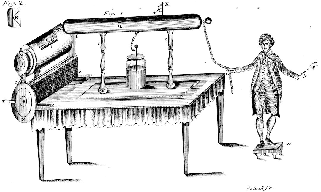 “A tin tube, or a man, placed upon electrics, is electrified much stronger by this means, than in the common way.—When I present this phial and nail to a tin tube, which I have, fifteen inches long, nothing but experience can make a person believe how strongly it is electrified. Two thin glasses have been broken by the shock of it.”