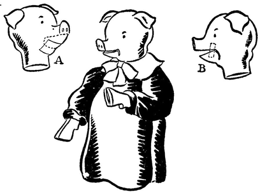 You may wish to know how puppets found their way from Italy to France. There were two brothers, Giovanni and Francesco Briocchi. Francesco was a skilful wood carver and mechanic. Giovanni was very clever with his speeches and jokes. As children, they loved marionettes. They hardly knew which they enjoyed more, sitting in the audience watching the play, or standing behind the stage watching their friends manipulate the puppets. They decided that when they grew up they would be puppeteers, make their own puppets and travel from town to town and to the fair land of which they had heard so many interesting tales. This they did. Giovanni made the figures skilfully and dressed them beautifully. Francesco made them say and do such clever and amusing things that their fame went before them into small towns and into the large cities. When they had made enough money they said, “Now we can go to France. We can easily carry our little stage and puppets on 16our backs. We can earn our way by giving plays.” This they did, to the delight of all who saw them. Finally they reached the city of Paris. In those days great fairs were held where people came to buy and sell and to make merry. Here was just the place for Giovanni and Francesco. When the fairs became permanent the brothers decided to settle down and make a real home for their marionettes. This at first was a simple kind of theater, but later came to have every beautiful thing that French taste and ingenuity could provide. One day the king and queen made them a visit and engaged them to come out to their beautiful château at St. Germain en Laye and give puppet plays for their young son, the dauphin, and his friends. In the records of France you may still see the account as it stands: “Sept. 1669, to Jean Briocchi, divertir les enfants de France, 1365 livres.” When the Frenchmen saw the success of the Italian showmen, they, too, began to make puppets and to take them to the places where people gathered who might be willing to spend a few sous for entertainment. Among these was an old dentist, who found it difficult to earn a living. He made some marionettes and a clever little boxlike stage with a curtain about it. It was just large enough for him to stand inside and manipulate the puppets. He decided to take his stand to the Pont Neuf, one of the principal bridges of Paris. Here he would pull teeth when anyone needed his services and for the rest of the time would entertain the people. He had also a very celebrated monkey, called Fagotin, that he knew would attract 17a crowd. Fagotin he dressed as a sentry, gave him a sword, and trained him to march up and down in front of the little puppet booth. One day a great poet, whose name was Cyrano de Bergerac, was crossing the bridge and stopped, as did most of the people, to see Fagotin and the puppets. It happened that the poet had a very large nose and was a very sensitive person. When he saw Fagotin marching up and down and making grimaces, he thought he must surely be making fun of his large nose. At this, the poet was so angry that he challenged him to a duel. Poor little Fagotin drew his sword with the air of a master of the foils, only to be slain by the irate poet.