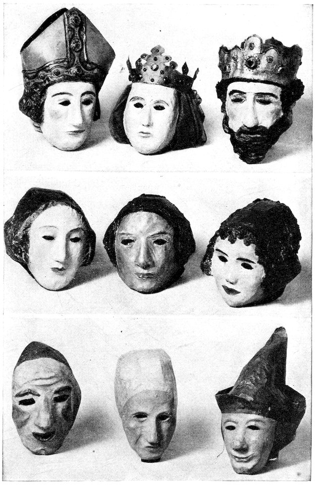 | Masks. Upper. Mummer, Queen, Jester. Middle. Egyptian Priest, Persian Poet, Greek Maiden. Lower. Columbine and Pierrot | 158 |
