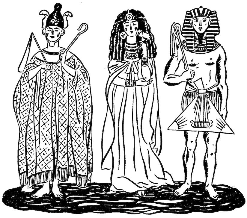 Imagine a very long avenue with a row of carved stone figures called sphinxes on either side, leading all the way up to a great temple. Imagine a slowly moving procession of a hundred priests on its way to the temple to do honor to the great god Osiris. These priests are carrying a colossal golden boat on their shoulders. But more wonderful than the temple with its lotus-flower columns and its beautiful colors, more wonderful than the golden boat carried by these white-robed priests, was a marvelously made statue of the god Osiris, which rode in the golden boat. It moved its head constantly from side to side. The priests knew which way it wished to go by the way it turned its head. This figure of the god was a marionette. We also know that the ancient Egyptians had miniature puppet stages. One has been unearthed which has doors of ivory with the rods and wires still in their places. Among the Egyptian puppets that have been found was one of a crocodile. Its lower jaw moves on a pivot and its feet are connected with a kind of hinge.