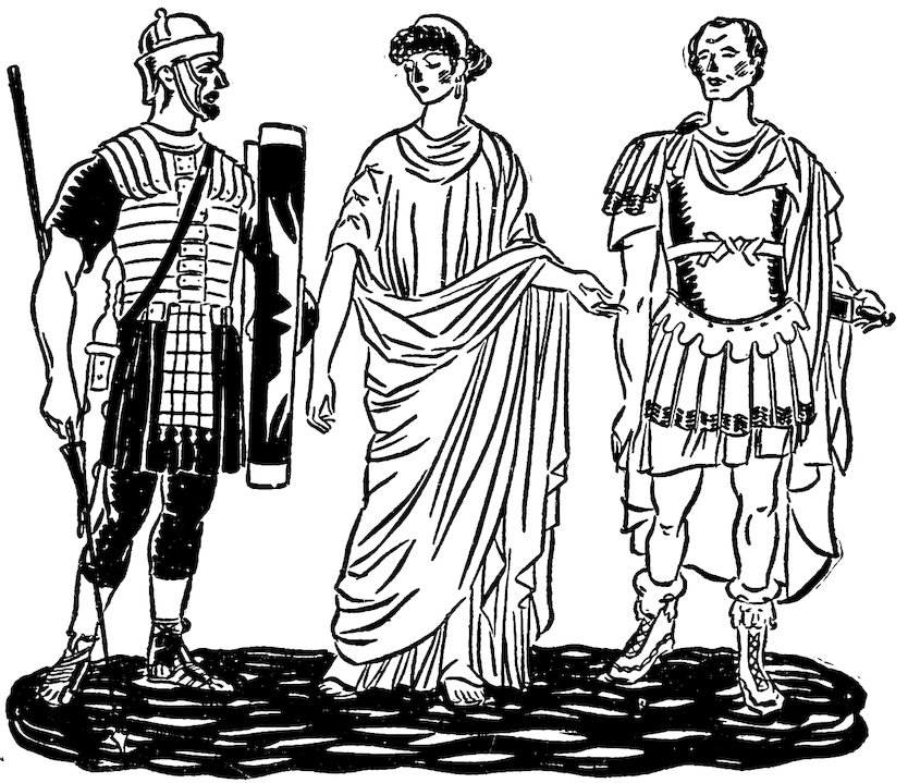 There were three kinds of Roman marionettes. The simplest kind was the Burattini, a kind of marionette 9that is much like a mitten. They were shown on the street corners by a showman who needed no more than two—one for each hand. It cost almost nothing to see them. The shopkeepers, gladiators, slaves, and surely the Roman children came to look whenever they heard the showman’s fife. He would make them act droll little dialogues or pretend to sing popular songs. There was another kind called Fantoccini. These were jointed dolls strung on cords that were drawn across the knees of the operator. He usually sang or played some musical instrument while he made certain movements with his legs that caused the puppets to advance or retire or to move all in one direction. A third kind of marionette was manipulated by strings or wires from above.