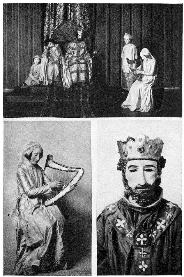 It was before the Holy Sepulcher in Jerusalem that the greatest of the early passion plays were given by marionettes, plays so simple and religious that they were greatly loved by the devout pilgrims who came to that sacred shrine. It was here that puppets were probably seen by the first crusaders who, no doubt, had much to tell of them when they returned to their far-distant homes. Puppets lived in the churches, just as they once had lived in the temples. The plays they gave were called Mysteries. These puppet mystery plays were to be seen in both the churches and the monasteries of all medieval Europe. They were solemn festivals of sacred commemoration. Into the naves and chapels of these early churches, large wooden stages were built, carpets were spread on the floors, tapestries were hung on the walls. At the back of these stages, evergreen trees were placed and in front of the trees there were stones. These were covered with plants and moss in imitation of the hills and valleys and pathways of the Holy Land. Everything was so arranged that these marionettes could give the most dramatic scenes in the life of Christ. The little figures were carved from wood, colored to life, richly clothed, adapted by mechanisms so that their limbs could be made to move by the action of springs and levers.