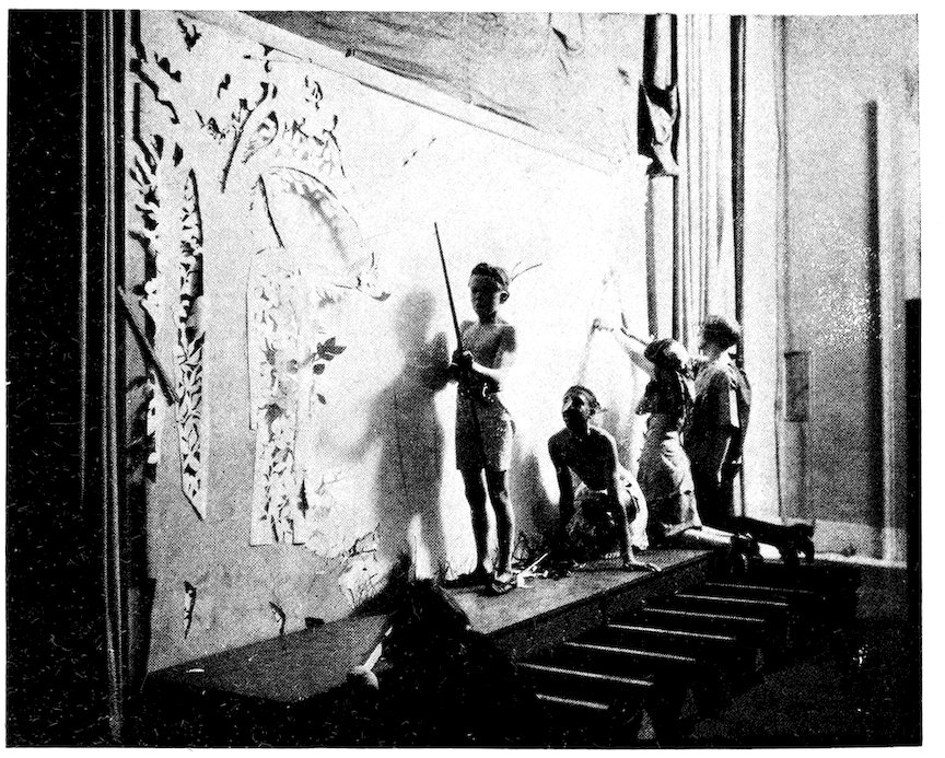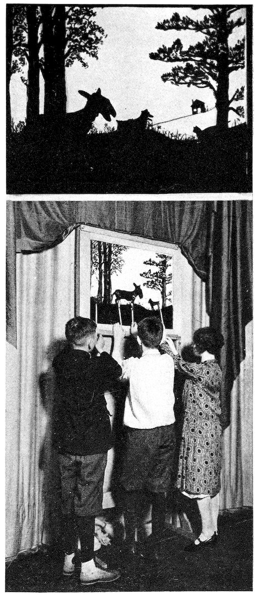 | Upper: Scene from cut out shadow play, “The Traveling Musicians of Bremen.” Lower:—Behind the scene in a cut out shadow play, given by eighth grade pupils of Fairmount Junior High School, Cleveland, Ohio | 210 |
