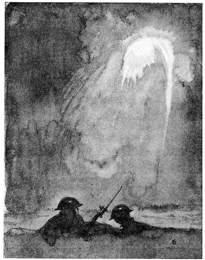 The 75s flew with angry whines that arched across the sky 210and smote with red and green flames along a line.... There was a spatter of rifle-fire toward the right; flares went up over the dark loom of the Bois; a certain violence of machine-gun fire grew up and waxed to great volume, but always to the right. Forward, where the shells were breaking, there was nothing....