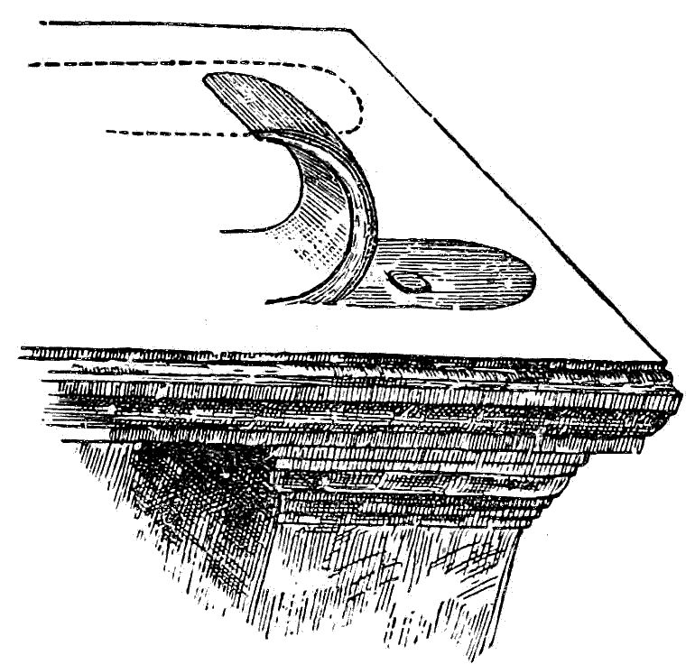 Wherever possible and suitable I would advise the use of glue in putting up finish, and I may here remark to the workman, that after a little practice in the use of glue and a little knowledge of its worth and capabilities, he will prefer it, to nails or screws where he can apply it; further on I will give a few hints and suggestions on the proper methods of using glue in house finishing. Of course, I am well aware that the use of nails and screws is a necessity in wood-finishing, but where the work is to be left natural color, or stained and polished, there should not be the slightest suspicion of a nail or screw head, and to meet this condition the skilled workman resorts to several expedients to hide the fastenings among which are the following. These methods, which are similar, are called “sliver-nailing,” or sometimes, “chip blind-nailing.” In the first method, shown at Fig. 1, the[11] wood is raised with a firmer chisel and the screw or nail is then put in place and driven home. At Fig. 2, the “sliver” or chip, is raised with a gouge. In the first instance a sharp knife should be employed to draw lengthwise with the grain two deep cuts the width of the chisel, as this keeps the sides of the chip from splitting. The chisel should be set at a steep angle at first till the proper depth is reached, and then made to turn out a cut of even thickness until there is room to drive in a screw or nail. If too sharp a curve is given, the “sliver” is likely to break apart in being straightened out again. In Fig. 2, I show how the “sliver” is raised by using a gouge. To do this nicely a gouge about three-quarters of an inch across the face should be used and the curve should be quick. In this case no knife cut is needed, as the corners of the gouge will cut as it progresses.