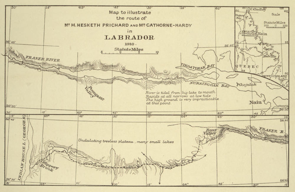 Map to illustrate the route of MR. H. HESKETH PRICHARD and MR. GATHORNE-HARDY in LABRADOR 1910.
