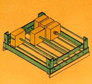 This torpedo, 12½ inches long and 3¹/₁₆ inches square, inside measurement, is made of tin and is closed at the lower end. It is coated inside and out with shellac. To the upper end is soldered a [Pg 3] brass flange having a loop on one side and a throw-back hinge on the opposite side. The cover consists of a square brass plate with two loops one of which rests over the loop on the flange, the other receiving the lug of the throw-back hinge. A thumb-screw, fitted to the end of the lug, secures one side of the cover and a transportation thumb-screw, fitted to the loops, secures the other side. The cover bears a stuffing-box for the entrance of the spar leading-wires. A rubber washer between the cover and flange makes the case water-tight. A loop is fitted to one side of the case to receive the lower end of the spindle.